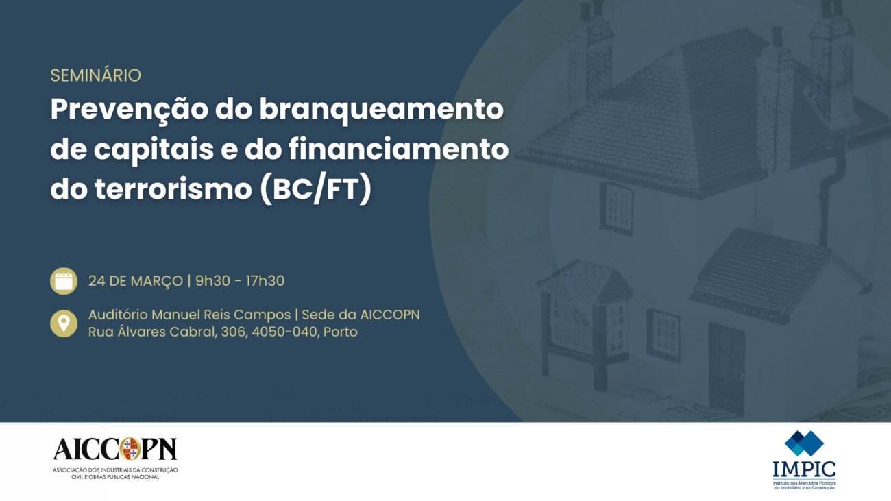 A AICCOPN e o IMPIC, I.P. promovem, no próximo dia 24 de março, entre as 9h30 e as 17h30, o seminário “Prevenção do branqueamento de capitais e do financiamento do terrorismo (BC/FT)”.