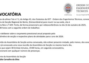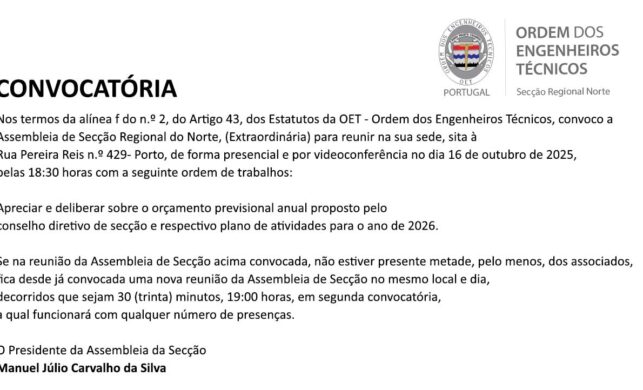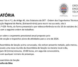 A Ordem dos Engenheiros Técnicos – Secção Regional do Norte, vai levar a efeito, no próximo dia 12 de julho, pelas 14:30 horas, no Auditório